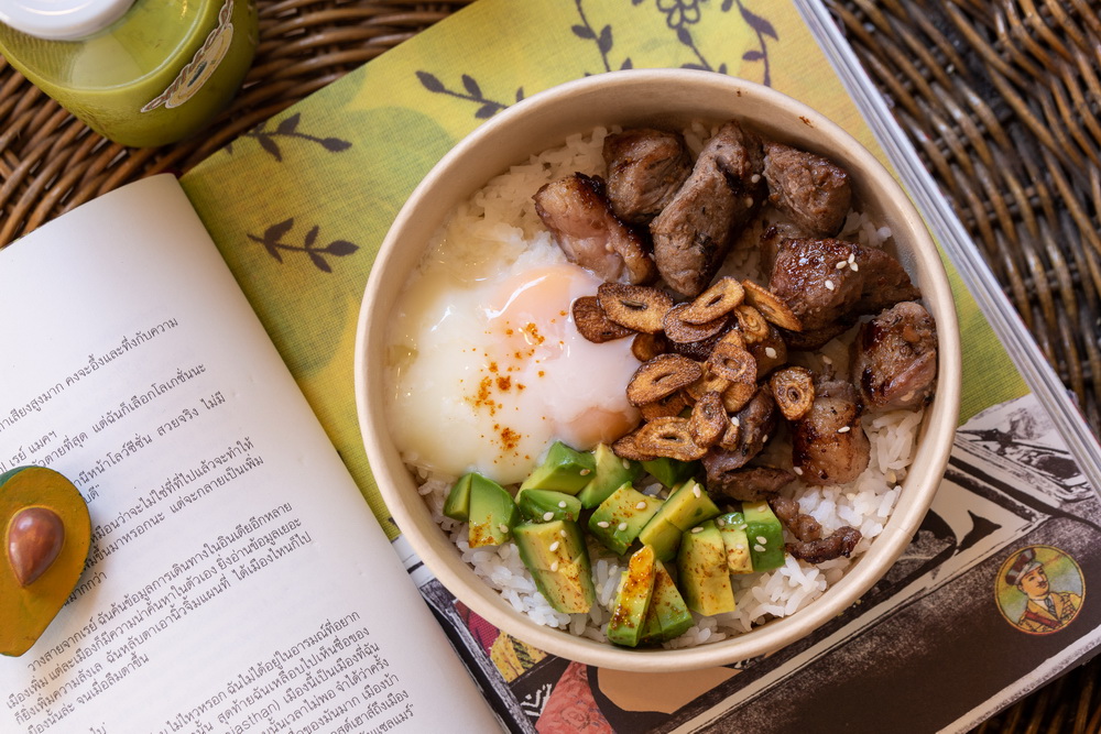 ต่อจากหน้าร้านที่สวยจนใครก็อดถ่ายรูปไม่ได้ ก็เป็นส่วนของพาร์ตอาหารที่เพิ่งเริ่มโปรโมตเมื่อไม่กี่วันมานี้ เริ่มจาก Grilled Beef Avocado Don (169 บาท) เมนูข้าวหน้าสไตล์ลูกครึ่งญี่ปุ่น-อเมริกัน ที่ได้แรงบันดาลใจมาจากอาหารฮาวายอย่าง Poke (เมนูข้าวหน้าที่มักเสิร์ฟคู่กับปลาดิบ) มีโปรตีนหลักเป็นเนื้อติดมันชิ้นโต ๆ หมักพริกไทยดำ ย่างเนยพร้อมอะโวคาโดสด และโปะหน้าความฟินด้วยไข่ออนเซ็นฟองใหญ่