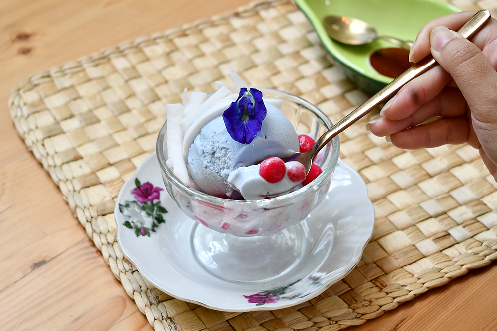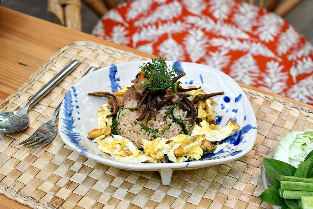 ปิดท้ายด้วย ข้าวผัดชายทุ่ง (180 บาท) อาหารจานเดียวที่รวมเอาความรักของครอบครัวนักชิมอาหารครอบครัวนี้ไว้ ทั้งข้าวผัดชะอม น้ำพริกกะปิ ปลาทู และปลาคังทอดกรอบ จนได้เป็นสูตรลับจานใหม่ที่หาทานที่ไหนไม่ได้อีกแล้วนอกจากร้านนี้เท่านั้น และตบด้วยของหวานอย่าง ไอศกรีมกะทิบัวลอย (90 บาท) ที่นอกจากจะอร่อยเพราะไอศกรีมกะทิอบควันเทียนแล้ว ยังขึ้นกล้องด้วยสีฟ้าจากดอกอัญชันที่ใส่ลงไปในไอศกรีม และสีแดงสดคล้ายทับทิมกรอบ แต่ที่จริงแล้วเป็นบัวลอยเนื้อเหนียวนุ่มหนึบอีกด้วย