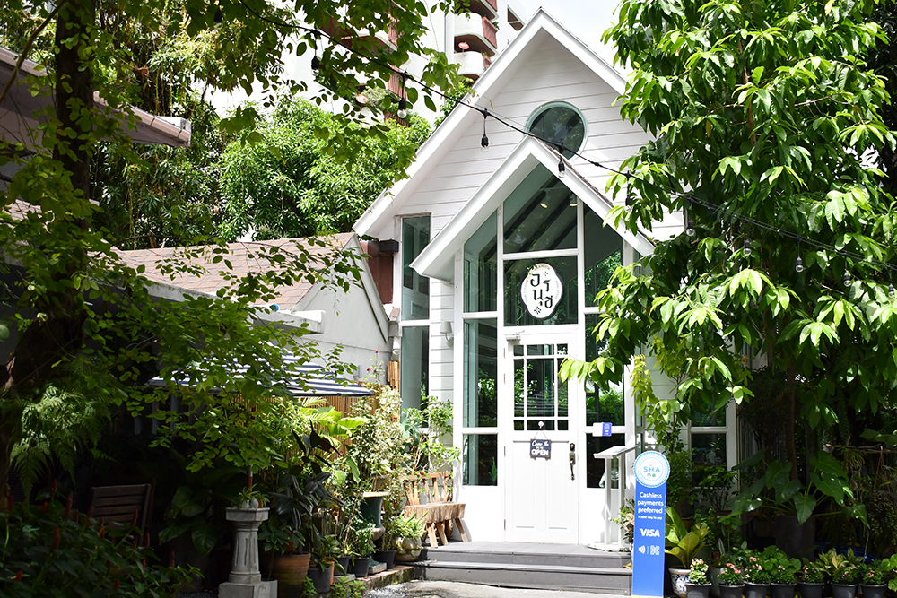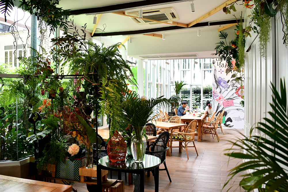 แค่เห็นตัวร้านด้านนอกที่โดดเด่นด้วยโครงสร้างแบบเรือนกระจกสีขาวหลังงาม รวมถึงการใช้ฟอนต์ในโลโก้ร้าน ก็ชวนให้คิดถึงร้านบ้านหญิงทดไว้ในใจแบบไม่ต้องบอกใคร ภายในตกแต่งด้วยสีสันฉูดฉาดสดใสของเบาะเก้าอี้ ภาพเพนต์ประดับผนัง และแซมด้วยสีเขียวของต้นไม้ใบหญ้าที่เติมชีวิตชีวาให้เรือนกระจกสีขาวหลังนี้ดูเต็มเปี่ยมไปด้วยพลังงานบวก