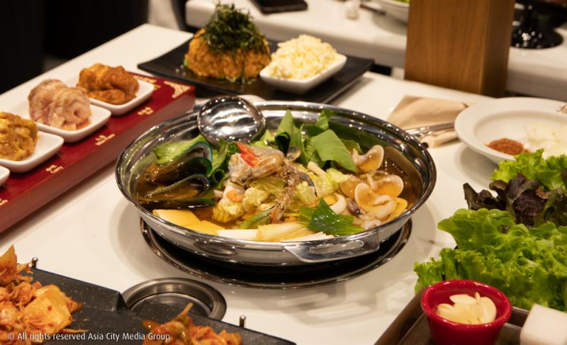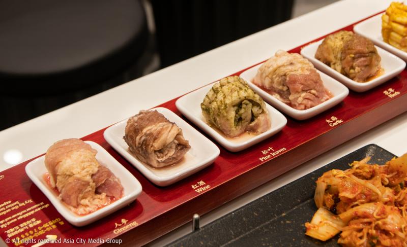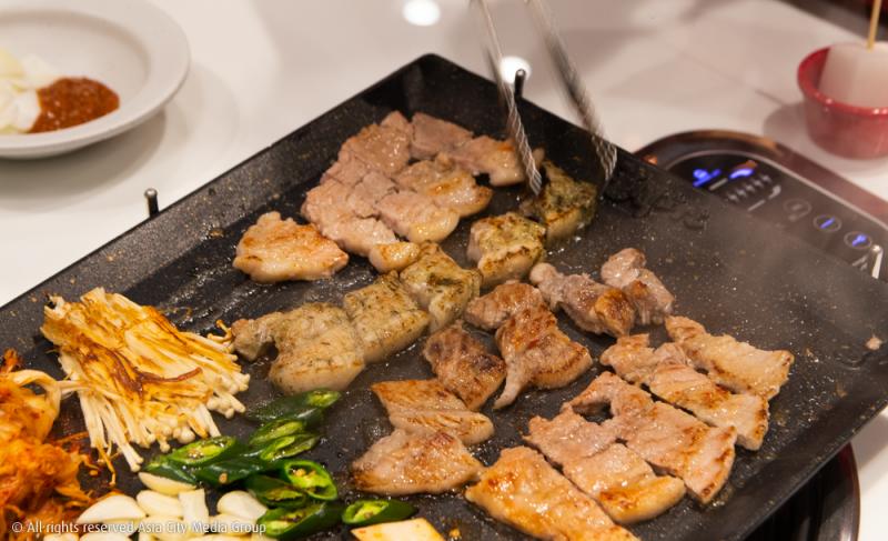 แม้ร้านจะมีขนาดไม่ใหญ่มาก แต่เมนูที่ทางร้านมีคือเยอะเวอร์ สิ่งหนึ่งที่ต้องไม่พลาดแน่ ๆ คือเซ็ตหมูย่าง 8 สี (850 บาท เพิ่มซุปกิมจิหม้อไฟ / ซุปใสหอยหม้อไฟ 980 บาท และซุปซีฟู้ดหม้อไฟ 1,035 บาท) ที่ทางร้านได้ส่งเชฟไปเทรนนิงถึงเกาหลีใต้เลยทีเดียว ในเซ็ตจะประกอบไปด้วยหมู 8 สี ผัก เห็ดย่าง และเครื่องเคียงต่าง ๆ โดยหมู 8 สีนั้นจะถูกหมักกับซอสสูตรพิเศษที่ทางคุณฝนได้สิทธิ์ในการผลิตซอสทั้งหมดเพื่อส่งให้กับร้านในเอเชียอาคเนย์ด้วย ซึ่งทางเจ้าของที่เกาหลีถึงกับเอ่ยปากว่าซอสที่ทางกิจการครอบครัวของคุณฝนผลิตให้นั้นได้มาตรฐานสูงจริง ๆ