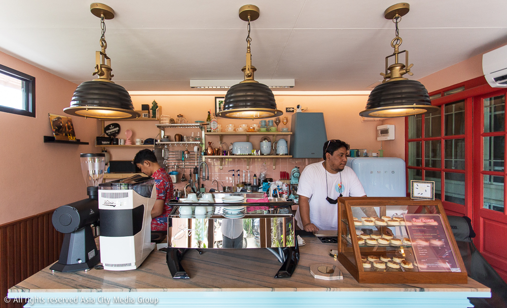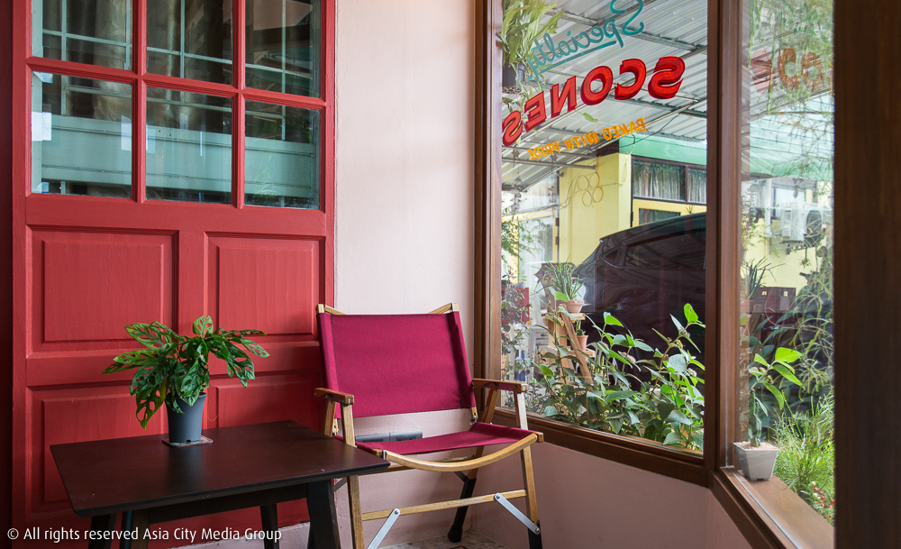 ตัวร้านสีพาสเทลถูกตัดความสาวลงไปด้วยกระจกกรอบไม้สีเข้ม เราชอบการแต่งกระจกด้วยฟอนต์คำภาษาอังกฤษที่ชวนให้นึกถึงกลิ่นอายของยุค 60s เบา ๆ หน้าร้านแต่งเป็นสวนสีเขียวขนาดเล็กที่มาพร้อมเก้าอี้ยาวแสนคิวต์ที่ได้ประโยชน์ถึงสองต่อ คือทั้งเอาไว้นั่งรอตอนที่ด้านในเต็ม กับเอาไว้ให้สาว ๆ หนุ่ม ๆ ได้สร้างแลนด์มาร์กถ่ายรูปแบบรัว ๆ ส่วนพาร์ตตกแต่งด้านในเขาก็มีความตลกอุปกรณ์อยู่ประมาณนึงทีเดียว ทั้งการวางเครื่องครัวจาก Smeg หลายชิ้นบนชั้นวางของ ไปจนถึงเครื่องทำกาแฟ Slayer เครื่องใหม่เอี่ยมที่ตั้งตระหง่านกินพื้นที่เกือบทั้งหน้าเคาน์เตอร์บาร์ ใครที่เปิดประตูร้านเข้าไปก็อย่าเพิ่งตกใจกับอุปกรณ์และเครื่องกาแฟจนลืมมองทีเด็ดของร้านนี้อย่างขนมสโคนที่วางเรียงอัดแน่นกันอยู่ในตู้ขนมข้าง ๆ ด้วยล่ะ!