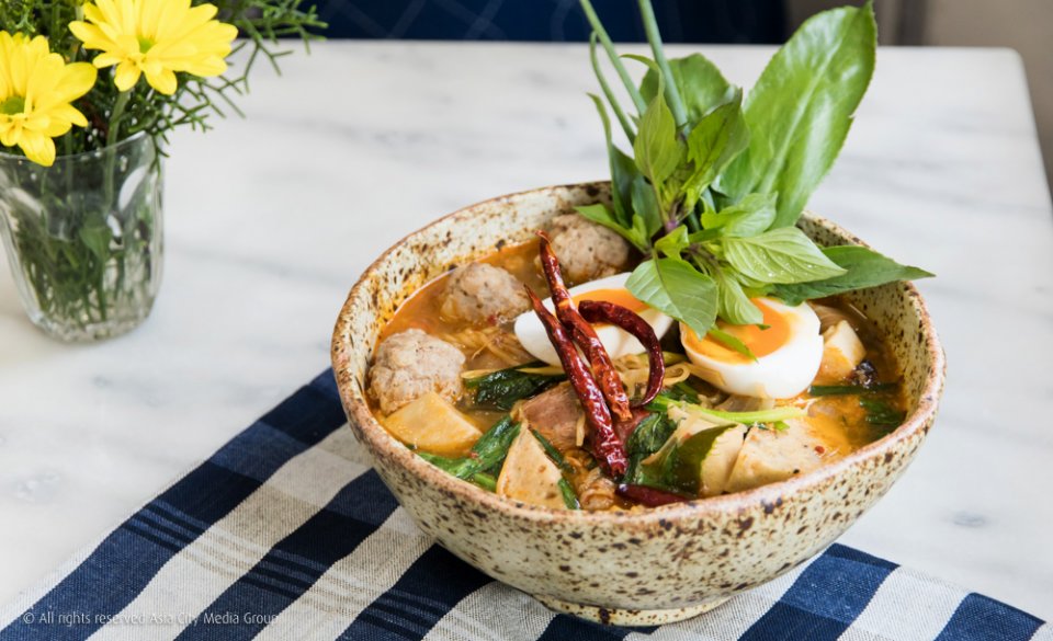 ส่วนถ้าไปคนเดียว เราแนะนำให้สั่งมาม่าต้มแซบหมูเยอะ (100 บาท) ที่มาพร้อมกับ ไส้กรอกเวียดนาม ลูกชิ้นหมู ไข่ลวก ในน้ำซุปต้มแซบ แต่ต้องระวังไว้ด้วยนะว่าความเผ็ดพื้นฐานของที่นี่เริ่มต้นที่พริก 8 เม็ด เพราะฉะนั้นเพื่อความปลอดภัยอย่าลืมสั่งน้ำผลไม้ (35 บาท) และโซดาผลไม้ (55 บาท) หรือน้ำเปล่า (15 บาท) มาเตรียมไว้ใกล้ตัว