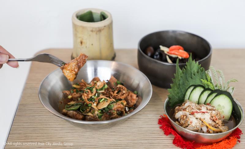 ส่วนเมนูแปลก ๆ ที่เราอยากให้ทุกคนมาลองก็มีตั้งแต่ พะโล้เห็ดถอบไข่นกกระทา (255 บาท) จับแรร์ไอเทมพื้นบ้านจากภาคเหนืออย่างเห็ดถอบมาทำเป็นพะโล้ ใช้ไข่นกกระทาแทนไข่ไก่ จับคู่กับเมนูเผ็ดนัวอีกสองจานอย่าง ต้มแซ่บแห้งเอ็นตุ๋นเนื้อสามชั้นตุ๋น (295 บาท) และ ปลาร้าปลาหมึก (155 บาท) ที่เปรียบเทียบได้กับเมนูทาโกะวาซาบิของญี่ปุ่น แต่เปลี่ยนเป็นใช้ปลาหมึกมาดองในน้ำปลาร้าแทน