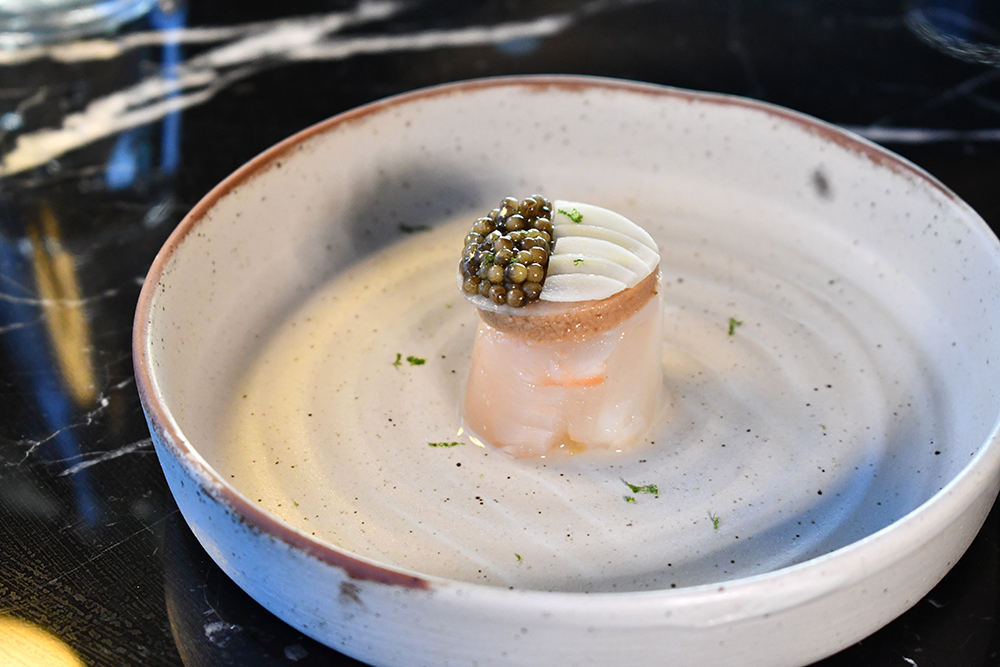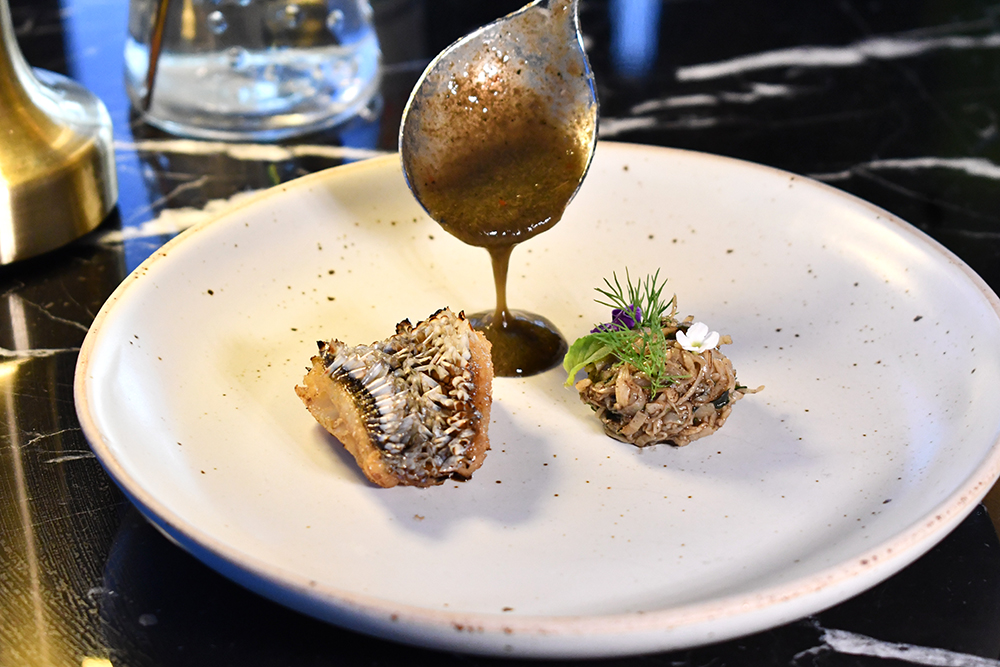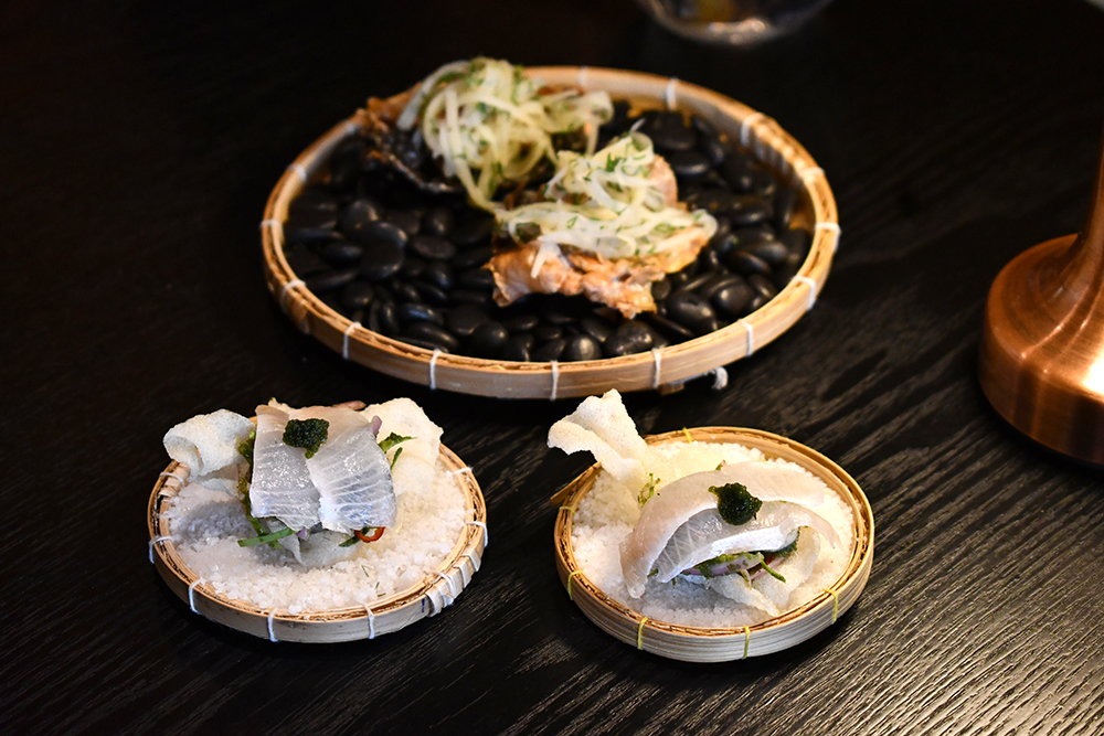 อย่างที่จะสังเกตได้ตั้งแต่คำออร์เดิร์ฟที่เสิร์ฟมาในห้องรับรองพิเศษก่อนย้ายไปทานที่โต๊ะอาหารจริง ซึ่งเชฟเทพบอกว่า 2 คำแรกนี้ ถือเป็นคำที่เชฟ 'โปรด' เป็นอันดับต้น ๆ ของคอร์สนี้เลยก็ว่าได้ เพราะเป็น 2 คำที่ไม่ตายตัวที่สุด วันไหนมีวัตถุดิบอะไรก็เอามาทำ อย่างที่เราได้ลองจะเป็นปลากะมงพร้าว วัตถุดิบไฮไลต์หลักของคอร์สนี้ โดยเชฟจับมาเอจเพื่อไล่ความชื้น และเสิร์ฟคู่กับไข่ผำ ซึ่งเป็นแหนน้ำจืดจากภาคอีสาน และไส้กรอกปลาแนมเสิร์ฟบนหนังปลาทอดกรอบ แถมด้วยเครื่องดื่มสุดพิเศษเป็นยาดองสูตรลับที่ผสมน้ำผึ้งป่ามาจนดื่มง่ายคล่องคอเพื่อเป็นเวลคัมดริงก์ก่อนไปชิมคอร์สหลัก