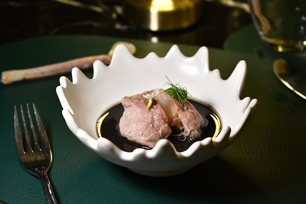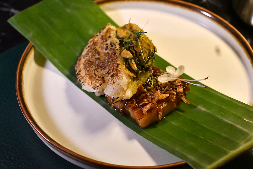 ถัดมาเป็นคำไฮไลต์ที่เราชอบมาก ๆ อย่าง Pak Moh Sao Nam เมนูไฮบริดที่เชฟเทพจับความละมุนของข้าวเกรียบ 'ปากหม้อ' มาเจอกับความเครื่องเยอะของขนมจีน 'ซาวน้ำ' จนได้มาเป็นคอร์สพิเศษที่รวมเอาของโปรดเชฟมาไว้ในคำเดียว พร้อมแถมปลากะมงพร้าวชุบข้าวพองทอดมาให้ตัดเลี่ยน และถัดมาคือ Run Juan หนึ่งในคอร์สที่ทุกคนชิมแล้วบอกตรงกันว่าอร่อย! เพราะเป็นการนำแกง 'รัญจวน' ไปเคี่ยวอย่างยาวนานจนซุปใส แต่รสชาติหนักแน่น เพิ่มรสด้วยตะไคร้ดองน้ำส้มสายชู และนำเอ็นหมูมาห่อเป็นเกี๊ยว เพื่อเพิ่มเทกซเจอร์กรุบกรอบให้คำนี้ได้อย่างลงตัว