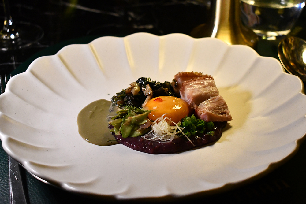 เมนูเมนคอร์สถูกเสิร์ฟมาในคอร์สสุดท้ายอย่าง Black Chicken Congee เมนูที่จับเอาโจ๊กมาแยกองค์ประกอบและประกอบเข้าไปใหม่ เริ่มจากเสิร์ฟโจ๊กข้าวเหนียวแดงและไก่ดำที่มาแบบเย็น เพื่อให้ตัดกับความร้อนจากหมูกรอบย่างสูตรเมืองตรัง ซึ่งเชฟเลือกใช้หมูที่เลี้ยงแบบไบโอไดนามิก ปราศจากสารเคมี พร้อมเพิ่มความเซอร์ไพรส์ด้วยไข่เยี่ยวม้าที่ถูกจับมาทำเป็นซอสแทนการเสิร์ฟแบบเป็นลูก ท็อปด้านบนด้วยไข่แดงดอง