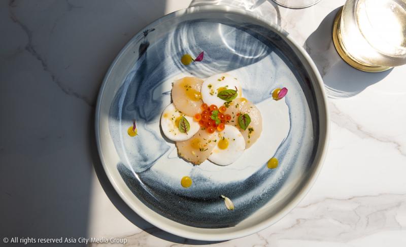 ต่อด้วย 'Beach' คอร์สแรกที่เชฟอยากสื่อถึงความสบาย ๆ ริมชายทะเลด้วยจานลายคลื่นน้ำสีฟ้า ตัดกับสีขาวนวลของมะพร้าวออร์แกนิคและหอยเชลล์ฮอกไกโดเนื้อขาวอวบที่เชฟนำไปหมักกับน้ำมันมะกอกผสมพริกแห้งและเครื่องเทศหลากชนิด เพื่อให้จานแรกนี้มีรสจัดจ้านติดลิ้น แต่ก็บาลานซ์รสชาติและสีสันไม่ให้โดดเกินไปด้วยไข่ปลาแซลมอน และเยลลี่ซอสรสมะม่วงผสมส้มยูสุ