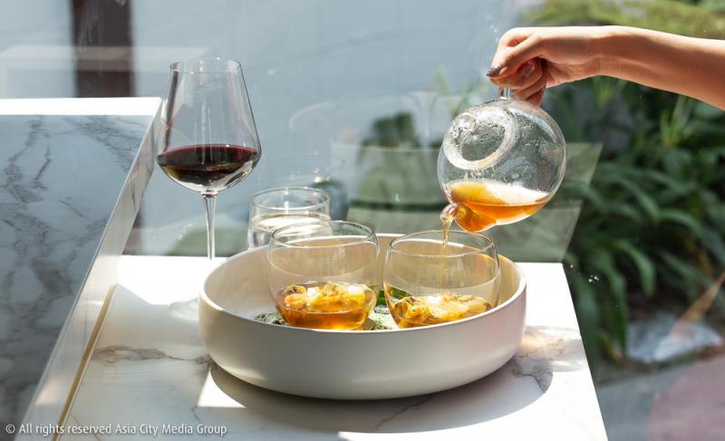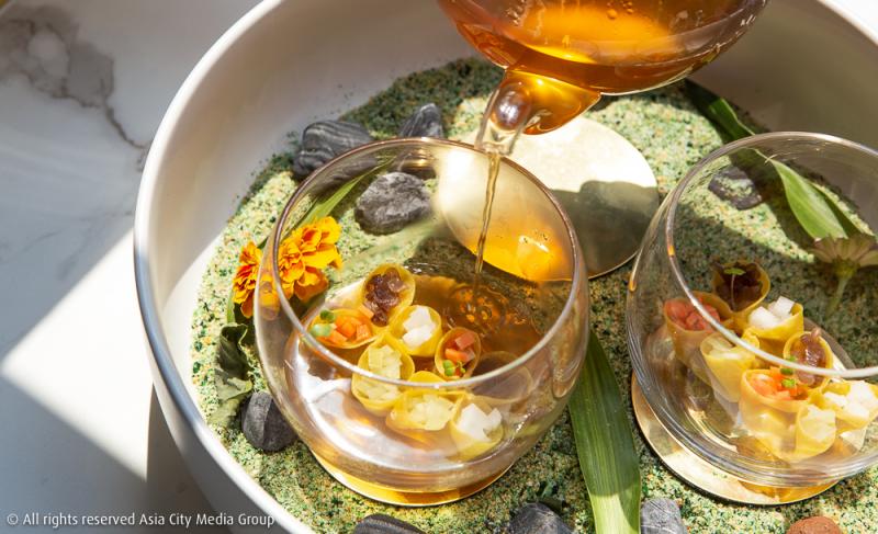 จานต่อมาเป็นจานที่เราชอบมากที่สุดในคอร์สนี้คือ 'Afternoon Tea in the Garden' แป้งพาสต้า Tortellini ที่ถูกนำมาทำเป็นทรงเกี๊ยวรูปดอกไม้ (ช่วงวาเลนไทน์เชฟบอกว่าอาจจะเปลี่ยนเป็นทรงดอกกุหลาบสีแดงด้วยนะ!) ยัดไส้เข้าไปด้วยกงฟีเป็ดที่ถูกซูวีด์มานานถึง 14 ชั่วโมงให้เนื้อเป็ดยังคงความนุ่มชุ่มฉ่ำ ท็อปด้านบนด้วยผักดองสีสวยที่ช่วยชูรสชาติให้จานนี้จัดจ้านดีงามตามท้องเรื่อง แถมยังเสิร์ฟมาพร้อมกาน้ำชาที่ข้างในมีซุปใส (consommé) ที่ต้มด้วยกระดูกเป็ดและกระดูกไก่ รวม ๆ แล้วเมนูนี้คือหน้าตาดีเหมือนได้จิบน้ำชาอยู่ในสวนดอกไม้เก๋ ๆ ตามชื่อเมนูนั่นแหละ