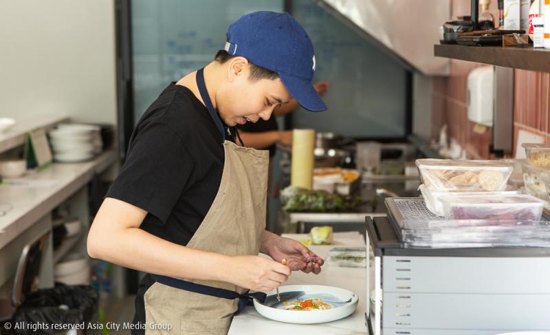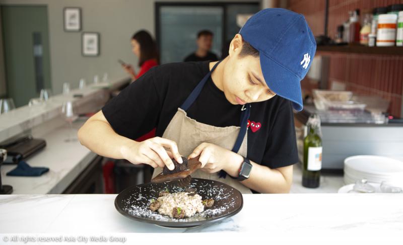ประโยคนี้น่าจะสื่อถึงบรรยากาศในร้านเชฟเทเบิ้ลร้านนี้ได้ดีที่สุด เพราะถึงแม้ความหรูหราของเฟอร์นิเจอร์ ความคุมโทนของสีร้าน และการจั่วหัวว่านี่คือร้าน 'เชฟเทเบิ้ล' จะทำให้เรารู้สึกเกร็งตั้งแต่ยังมาไม่ถึงร้านแล้วก็ตาม แต่พอเดินเข้ามาแล้วเจอกับเคาน์เตอร์บาร์เล็ก ๆ น่ารัก รองรับลูกค้าได้แค่ 12 ที่นั่ง ครัวแบบเปิดโล่ง คลีน ๆ ดูสะอาดและเป็นกันเอง แถมด้วยตัวเชฟในคอสตูมเสื้อยืดคอกลมสีดำ กางเกงยีนส์ พร้อมหมวกแก๊ปจากแบรนด์สตรีทแวร์เกาหลี ความเกร็งทั้งหมดที่เคยจินตนาการไว้ก็แทบจะลดลงเกือบหมด เข้าใจแล้วว่าทำเชฟโบว์ถึงเรียกร้านตัวเองว่าเป็นสไตล์ Casual Fine Dining