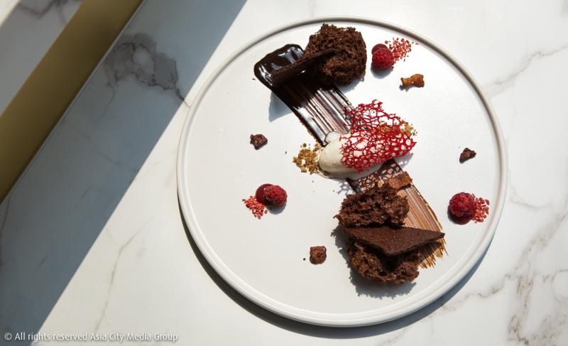 ปิดจ็อบคอร์สนี้ด้วย 'Dark Forest' ขนมหวานที่เชฟทำเองทุกขั้นตอน ตั้งแต่ไอศกรีมวนิลา ช็อคโกแลตเมอแร็งก์ และช็อคโกแลตเอสพูม่าเนื้อละมุน ความเซอร์ไพร์สคือการแอบหาว่าจานนี้มีเนื้อสัตว์ซ่อนอยู่ตรงไหน เชฟเลยเฉลยว่าที่รองด้านล่างไอศกรีมอยู่คือครัมเบิ้ลที่ทำมาจากไก่และเป็ด รวมถึงเบคอนเฟลคชิ้นเล็ก ๆ ที่โรยอยู่รอบ ๆ จานก็เป็นส่วนที่ทำให้ขนมหวานจานนี้แตกต่างกว่าชาวบ้าน แต่ก็ยังคงความคอนเซ็ปต์ 'Nice to meat you' อยู่
