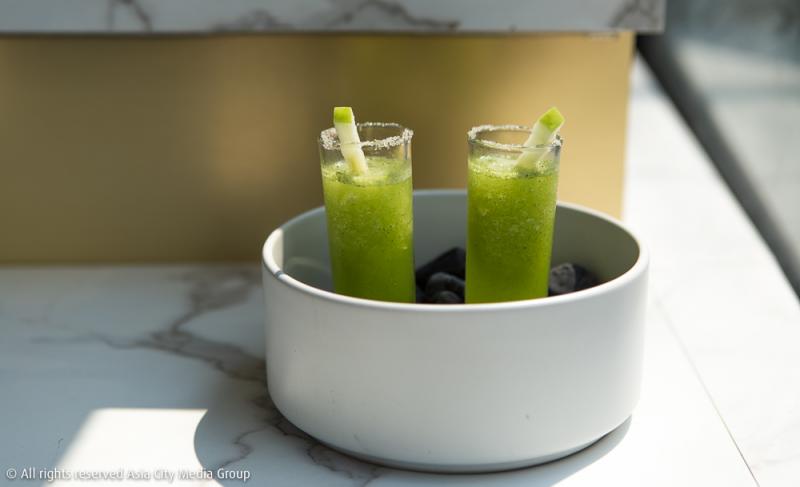 เวลคั่มดริ้งแรกเสิร์ฟมาในแก้วช็อตทรงสูงที่เชฟเลือกใช้รสเปรี้ยวของมะนาว รสหวานของลิ้นจี่ รสเค็มจากเกลือหิมาลายันสีชมพูที่เคลือบอยู่ตามขอบแก้ว และกลิ่นหอมคุ้นจมูกจากสมุนไพรอย่างใบเปปเปอร์มิ้นต์ที่ปลูกเองหลังร้าน มาทำเป็นเครื่องดื่มต้อนรับที่ช่วยเปิดต่อมรับรสให้รู้สึกอยากอาหารขึ้นกว่าเดิมอีก 10 เลเวล