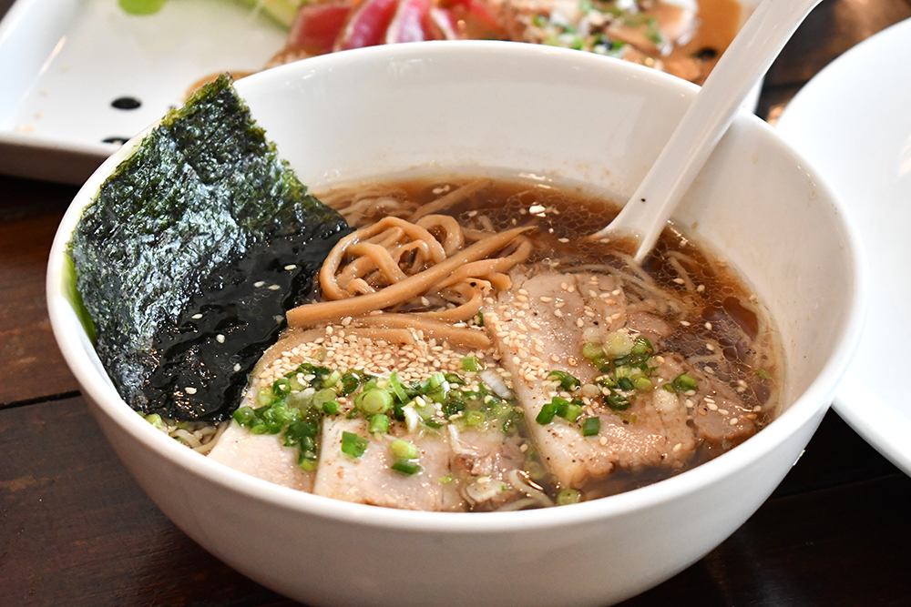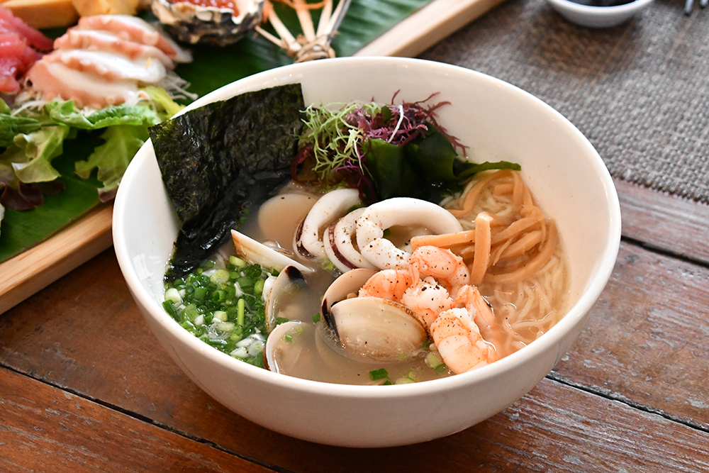 เริ่มจากเมนูฝั่งญี่ปุ่นที่เชฟทากะถนัดและเป็นเมนูแนะนำของร้านอย่าง Shoyu Ramen (185 บาท) โชยุราเมนสไตล์โตเกียวที่เคี่ยวน้ำซุปนานเป็นวันด้วยเบสวัตถุดิบธรรมชาติ 100% มีไฮไลต์เป็นหมูตุ๋นติดมันชิ้นหนาที่แค่ได้ชิมคำแรกก็น้ำตาไหลพราก เพราะมันอร่อยมากจริง ๆ การันตีจากคนรักราเมนอย่างเราที่ขอจัดอันดับให้ชามนี้ติดท็อป 5 ในประเทศ! ซึ่งนี่ถือเป็นเมนูของ Red Snapper ที่เราติดใจมาก ๆ ถึงขนาดกลับไปกิน 2 วันซ้อน ส่วน Seafood Ramen (195 บาท) ก็เป็นอีกหนึ่งเมนูที่ขายดีเป็นเทน้ำเทท่า โดยเป็นราเมนซุปเกลือซดคล่องคอตามสูตรลับที่บ้านเกิดของเชฟทากะ ซึ่งถึงแม้จะดูเป็นซุปใส ๆ แต่รสชาติแน่นเต็มปากเต็มคำจากการเอาเปลือกสัตว์ทะเลลงไปเคี่ยวเป็นเบสน้ำซุป