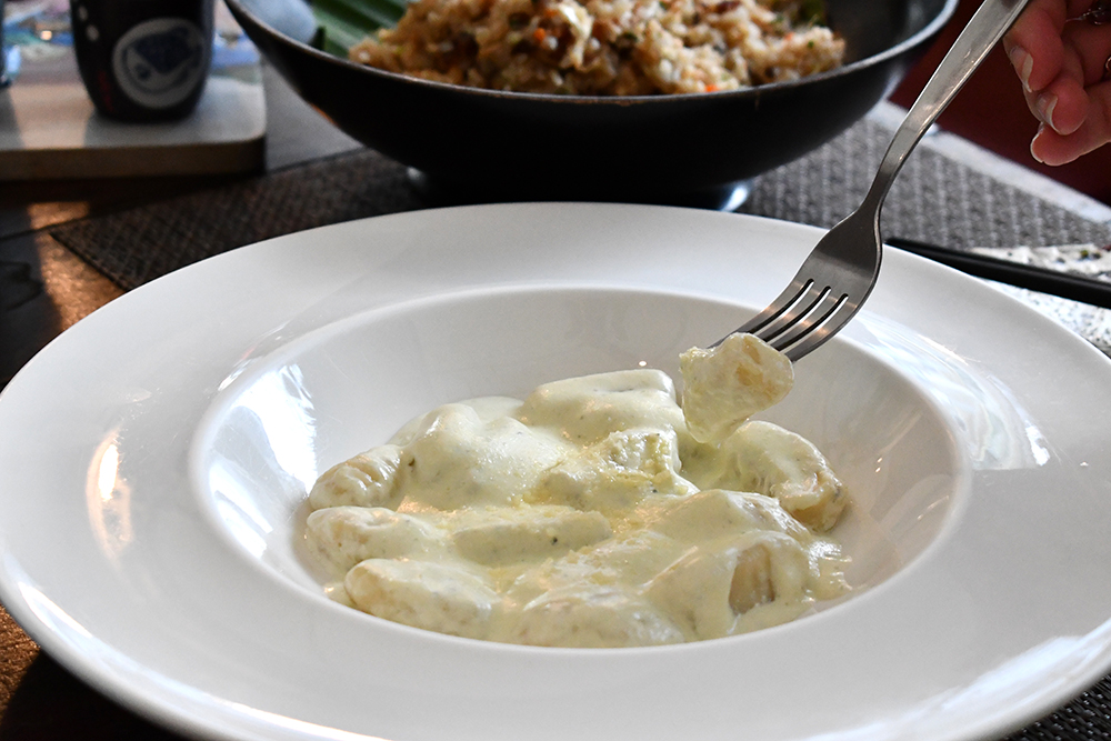 ข้ามไปที่ฝั่งเมนูอาหารอิตาเลียนที่เชฟทากะก็ถนัดไม่แพ้อาหารบ้านเกิด อาทิ Tuna Carpaccio (300 บาท) ที่ใช้ปลาทูน่าสด แล่บาง ๆ ด้วยเทคนิคการแล่ปลาแบบเชฟญี่ปุ่น เบิร์นด้านนอกนิดหน่อยแค่พอให้กลิ่นหอม ราดด้วยซอสมิโสะที่แต่งเติมความสดชื่นด้วยส้มยูซุ และวาซาบิ ซึ่งพี่มุกบอกว่าใครมา Red Snapper แล้วไม่สั่งเมนูนี้ถือว่ามาไม่ถึง กับอีกจานที่เราชอบมากคือ Gnocci with Mixed Cheese (195 บาท) พาสต้าปั้นมือจากมันฝรั่ง ราดด้วยครีมซอสที่ใช้ส่วนผสมจากชีสหลายชนิด ตัวย็อคคีเหนียวนุ่มหนึบเคี้ยวสู้ฟัน อร่อยแบบน้ำตาแทบไหล