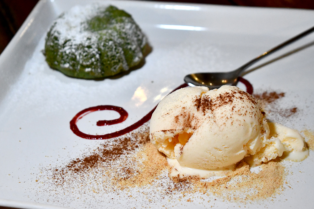 ปิดท้ายด้วยของดีประจำร้านอย่าง Homemade Warm Matcha & White Chocolate Cake (130 บาท) สปันจ์เค้กไวต์ช็อกโกแลตสอดไส้ซอสชาเขียวที่ไหลเยิ้มออกมาเป็นลาวา ทานคู่กับไอศกรีมวานิลลา เป็นของหวานที่ถ้าใครมาช้าก็อดกินแน่ ๆ เพราะขายดีมาก ๆ