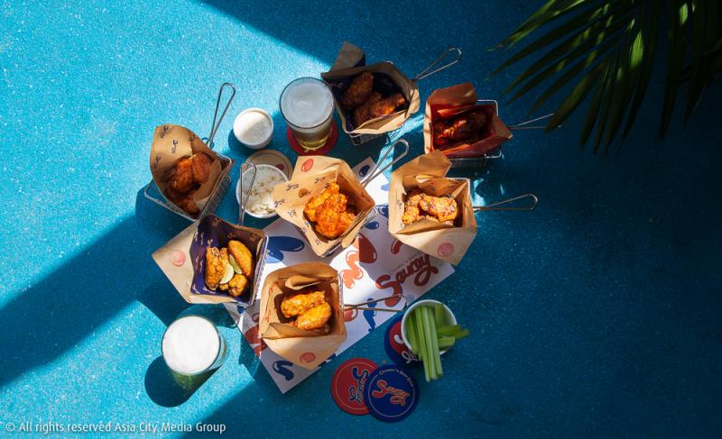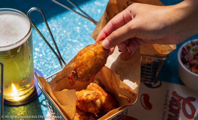 ส่วนไฮไลท์ที่ไม่พูดถึงไม่ได้ เพราะเป็นหนึ่งในสองอย่างที่มาจาก tagline ของร้านอย่าง 'Chicken and Beer Bomb' ซึ่งหมอโน้ตเล่าให้ฟังว่า สมัยเรียนอยู่อเมริกาจะชอบไปร้านบีชคลับที่ขาย Buffalo Wings มาก ๆ บวกกับความชอบในการตกแต่งร้านสไตล์บังกะโลที่บาหลี เลยอยากทำบีชคลับสไตล์ทรอปิคัลเป็นของตัวเองไว้ที่กรุงเทพฯ เอาไว้ปาร์ตี้กับเพื่อน ๆ และรองรับเหล่ามนุษย์ออฟฟิศในย่านสาทรด้วย