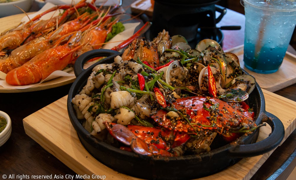 มาถึงเมนูไฮไลต์ของทางร้าน ที่นำเมนูขึ้นชื่อของฝั่งร้านดั้งเดิมมาเสิร์ฟแบบกระทะร้อน ซึ่งมีให้เลือก 3 อย่าง คือ ทะเลกระทะร้อนซอสกระเทียม ทะเลกระทะร้อนซอสไข่เค็ม และทะเลกระทะร้อนซอสพริกไทยดำ