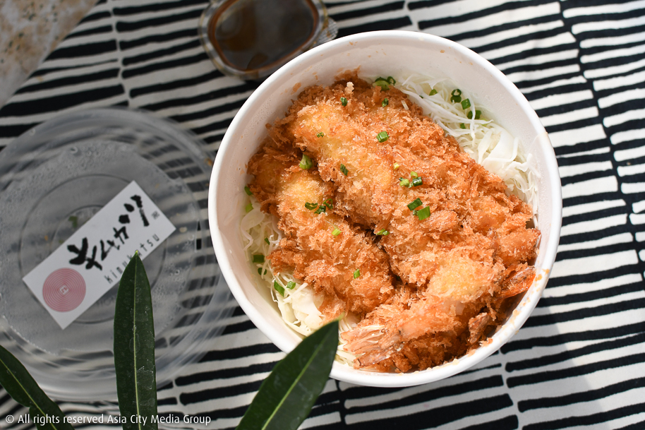 ที่แถมด้วยอีกกล่องคือน้อง 'ข้าวกุ้งทอดซอสคัตสึด้ง' กุ้งขาวตัวใหญ่ที่ถูกเอามาคลุกแป้งทอดกรอบสูตรสั่งทำพิเศษจากโรงงาน เฉพาะสำหรับร้าน Kimukatsu เท่านั้น ตัวแป้งบางกรอบเกาะเนื้อกุ้งแน่นหนึบ ส่วนเนื้อกุ้งก็เด้งดึ๋งเข้ากันกับข้าวญี่ปุ่นหุงร้อน ๆ ถ้วยนี้ถึงแม้จะเหมือนได้น้อย เพราะมีกุ้งแค่ 3 ตัว แต่กลายเป็นว่านี่แบ่งกันกิน 2 คน คืออิ่มแปล้ท้องแทบแตก!