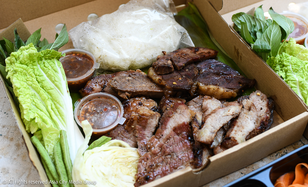 เราขอเริ่มจากเมนูที่อลังการที่สุดในเซตที่สั่งมาอย่าง รวมโคตรเนื้อ 490 บาท เมนูรวมเนื้อย่างสุกทุกไอเทมเด็ดของลาวต้มลาว คลุกเคล้าเครื่องเทศจนเข้าเนื้อและย่างต่อบนเตาถ่านจนติดกลิ่นสโมกกี้นิด ๆ มีให้เลือกทั้งเวอร์ชันหมูและเนื้อ เหมาะจะสั่งมาเพื่อเปิดตี้ล้อมวงแจมกับครอบครัว แพ็กมาให้พร้อมน้ำจิ้มแจ่วทีเด็ดรสแซ่บที่จัดจ้านถูกปากคนกรุงและข้าวเหนียวร้อน ๆ หนึ่งห่อ