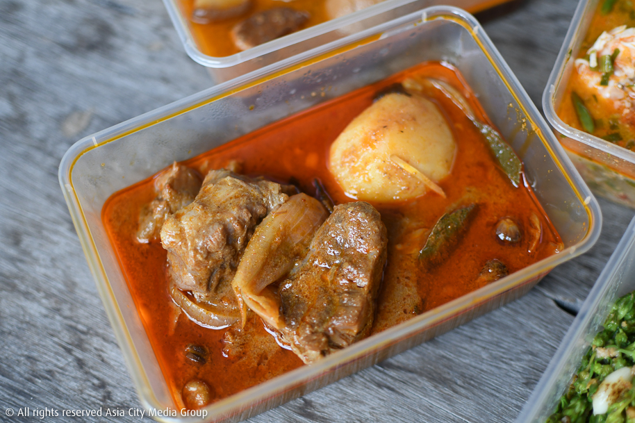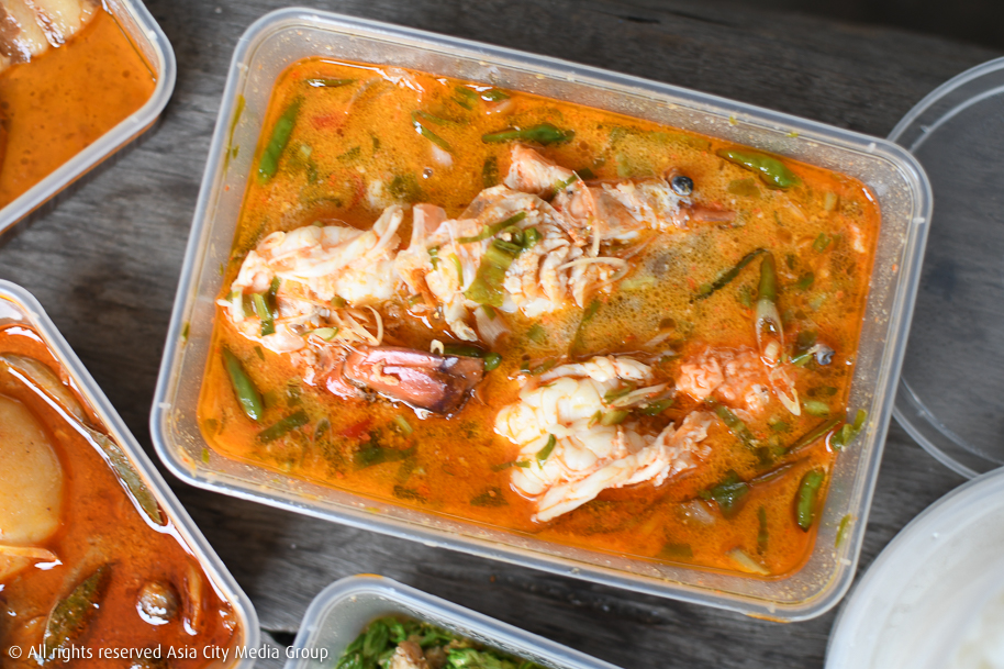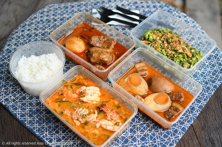 ส่วนนี่คือหน้าตาอาหารเมื่อเปิดกล่องมาแล้ว นอกจากสีสันจัดจ้านของเครื่องแกงแน่น ๆ อาหารของร้านป่าก์ทุกกล่องยังมาพร้อมกลิ่นหอมหวนชวนรับประทานที่แค่กลับมาดูรูปอีกรอบก็ท้องร้องซะแล้ว! เราขอเริ่มชิมจากเมนูแรกอย่าง มัสมั่นเนื้อน่องลาย (350 บาท) ที่มีความพิเศษตรงกลิ่นหอมของเครื่องเทศและสมุนไพรสดที่ต้องเอาไปเผาก่อนเพื่อชูกลิ่นอะโรมาติดสโมกกี้นิด ๆ เป็นเอกลักษณ์ให้เครื่องแกงที่นี่ไม่เหมือนร้านทั่วไป เชฟบอกว่ามัสมั่นตามสูตรโบราณจริง ๆ แล้วต้องใส่ขิงและใช้ความเปรี้ยวจากน้ำมะกรูด เอามาราดข้าวสวยร้อน ๆ ที่เชฟแถมให้ฟรีทุกออร์เดอร์ จุด ๆ นี้แถมมาให้ 10 ถ้วย ก็หมด 10 ถ้วยเด้อ!