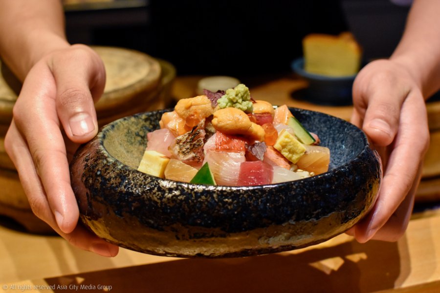 ถ้าใครคิดว่าสิบคำที่ผ่านมาจะไม่สามารถทำให้เราอิ่มท้องได้ เชฟก็เตรียมของหนักไว้รอเราในคำที่สิบสอง ซึ่งเป็นเตมากิไส้ทูน่า 3 ส่วน คือเนื้อแดง ชูโทโร่ และโอโทโร่ แล้วถ้ายังไม่สะใจอีก ขอเชิญไปต่อที่เมนูที่สิบสาม อันได้แก่ข้าวปลาดิบรวม (Shirashi) ที่ใช้ข้าวพิเศษที่มีความหอมหวานกว่าข้าวซูชิทั่วไป และปิดท้ายของคาวด้วยไข่ตุ๋นและซุปเป็นคำที่สิบสี่