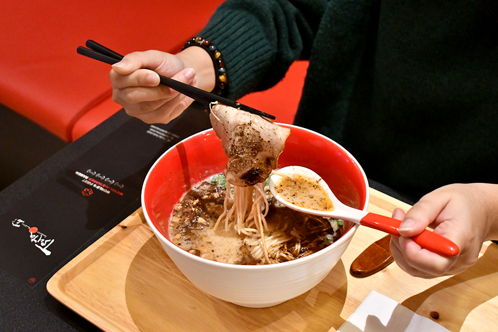 มาถึงเมนูพิเศษที่ไม่มีในโตเกียวอย่าง Kurobishio Tonkotsu Soba (270 บาท) ซุปทงคตสึที่นอกจากมีเบสเป็นน้ำซุปกระดูกหมูเข้มข้นแล้ว ยังเพิ่มพริกไทยดำมารัว ๆ เพื่อไม่ให้เลี่ยนมากไป แถมด้วยหมูคุโรบูตะชิ้นใหญ่ยักษ์ที่ถูก Char Siu (วิธีการทำคล้ายหมูแดง) โปะมาด้านบน แถมด้วยหมูสับรสเผ็ดที่เชื่อว่าใครที่ชอบซุปมัน ๆ เข้มข้น ๆ แบบทงคตสึราเมนเป็นทุนเดิม จะต้องเลิฟตัวนี้มากแน่ ๆ
