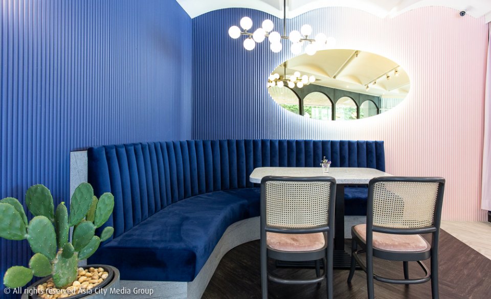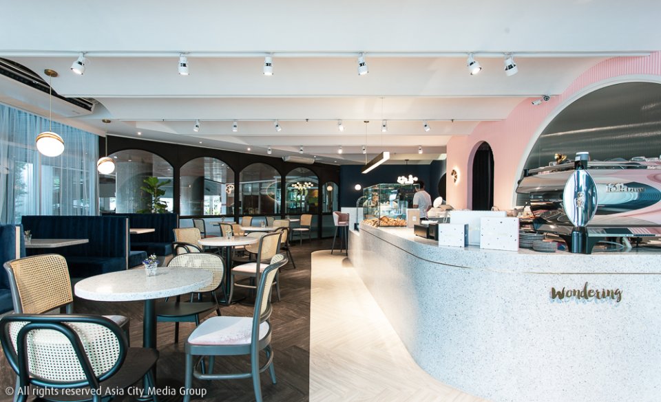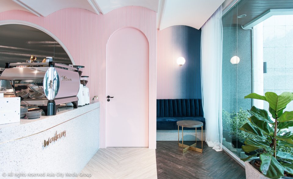 ฝั่งขนมว่าพีคแล้ว ที่พีคพอ ๆ กันจนทำให้ร้าน Wonder Cafe & Bakeshop สมบูรณ์แบบสำหรับสายคาเฟ่ฮ็อปเปอร์สุด ๆ คือความสวยงามของสถานที่ ซึ่งได้ Harisadhi หรือ พี่พลอย-หฤษฎี ลีละยุวพันธ์ Young Designer มาแรงแห่งยุคเป็นคนออกแบบร้าน โดยดึงเอาสีโลโก้เดิมของ Wondering มาเป็นคอนเซ็ปต์หลัก พร้อมด้วยดีไซน์แบบไล่สีกราเดี้ยนระหว่างชมพูพิ้งค์โกลด์และน้ำเงินเข้มแบบมิดไนท์บลู ออกมาเป็นคาเฟ่ลูกผสมสาวหวานปนสาวเท่