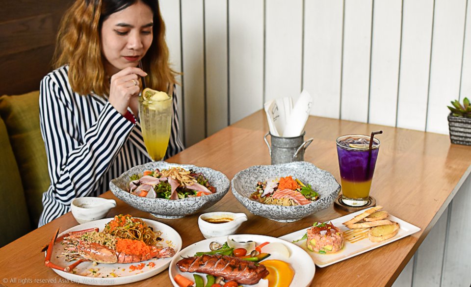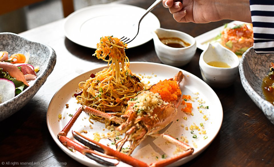 ส่วนจานหนักท้องอีกจานที่เราชอบสุด ๆ แต่ก็ยังอยากให้สั่งมาแชร์กันอยู่ดีเพราะ Portion ใหญ่มาก คือ Capellini Spicy Grilled River Prawn with Yuzu Butter (460 บาท) จัดเต็มด้วยกุ้งแม่น้ำตัวใหญ่ ๆ ทั้งตัว พร้อมพาสต้าเส้นคาเปลลินี่รสเผ็ด แล้วท็อปปิ้งแรง ๆ ด้วยไข่กุ้งที่เหมือนให้มาทั้งทะเล และทีเด็ดพิเศษคือการนำเนยไปผสมกับส้มยูสุ กลายเป็นยูสุบัตเตอร์ที่จับคู่กับเนื้อกุ้งแม่น้ำได้อย่างลงตัว