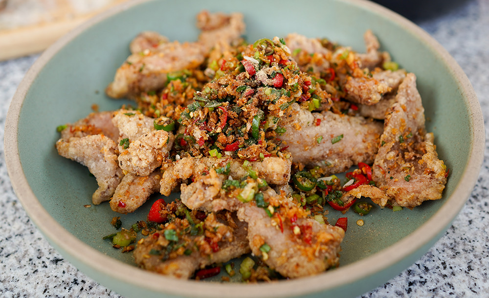 อีกหนึ่งจานที่จะสั่งมาเป็นกับข้าวหรือกับแกล้มก็ได้นั่นคือ คอหมูคั่วพริกเกลือ (220 บาท) ที่เขาใช้เนื้อหมูส่วนสันคอนุ่ม ๆ มีมันแทรก มาผัดกับพริก เกลือ และกระเทียม เพื่อเพิ่มเทกซเจอร์ความกรุบกรอบและรสเผ็ดซ่า เป็นเมนูง่าย ๆ แต่มัดใจชาวแก๊งที่ไปด้วยกันในวันนั้นแบบกินรวบโต๊ะ