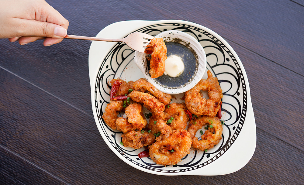 สำหรับสายกินดื่ม เราขอแนะนำให้เปิดมื้อด้วย ปลาหมึกกระเทียมกรอบ (220 บาท) หรือเมนูคาลามารีที่เราคุ้นเคยกันดี แต่ทางร้านมีทวิสต์ด้วยการจับหมึกทอดกรอบ ๆ มาคลุกเคล้ากับพริกแห้งและปาปริกาสุดเจ้มจ้น แล้วตัดรสเผ็ดซ่าลิ้นด้วยดิปซอสดำสูตรพิเศษที่ทำให้รสชาติทั้งหมดเข้ากัน