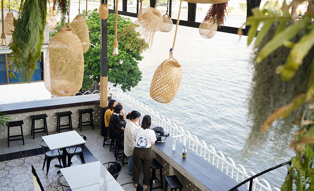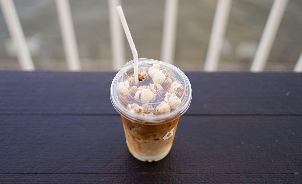 และอย่างที่เราบอกว่า ในตอนกลางวันทางร้านจะเปิดพื้นที่เป็นคาเฟ่ที่เสิร์ฟเมนูกาแฟและเครื่องดื่มต่าง ๆ ให้จิบกันชิลล์ ๆ ระหว่างนั่งดูวิวแม่น้ำเจ้าพระยา โดยเน้นเมนูกาแฟดื่มง่ายอย่าง Ice Popcorn Caramel Macchiato (140 บาท) ที่เป็นเหมือนเมนูป็อปคอร์นคาราเมลในรูปแบบดื่มได้