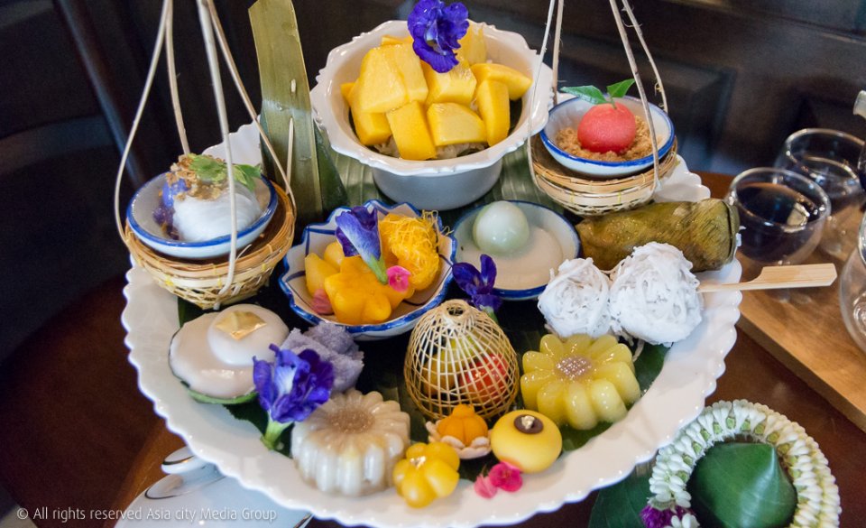 ขนมอย่างแรกที่ถ้าอยากลองกินให้ครบก็ต้องสั่งอย่างเซ็ตรวม นิมมานรดี (790 บาท) ที่ตั้งชื่อตามชั้นของสวรรค์ที่เหมือนเป็นการลำดับขั้นของความฟิน โดยมีอีก 2 เซ็ตคือ ดุสิตา (590 บาท) และยามา (490 บาท) โดยในเซ็ตก็จะมีขนมไทยสารพัดอย่าง มีข้าวเหนียวมะม่วง สาคูกะทิ และเครื่องดื่มเย็น 2 แก้วคือ น้ำพิงค์เก๊กฮวย และน้ำเก๊กฮวย (หรือจะเลือกเป็นชาร้อนก็ได้) หรือถ้าใครอยากกลืนคล่องคอแบบไม่เลี่ยนเราว่าชาร้อนก็เวิร์กอย่าง ชากุหลาบอัญชัญ (250 บาท) เสิร์ฟมาในกาแก้วที่มีเทียนให้ความร้อนตลอด กลิ่นชาก็จะหอมกลิ่นดอกไม้ กินขนมต่อได้สบาย
