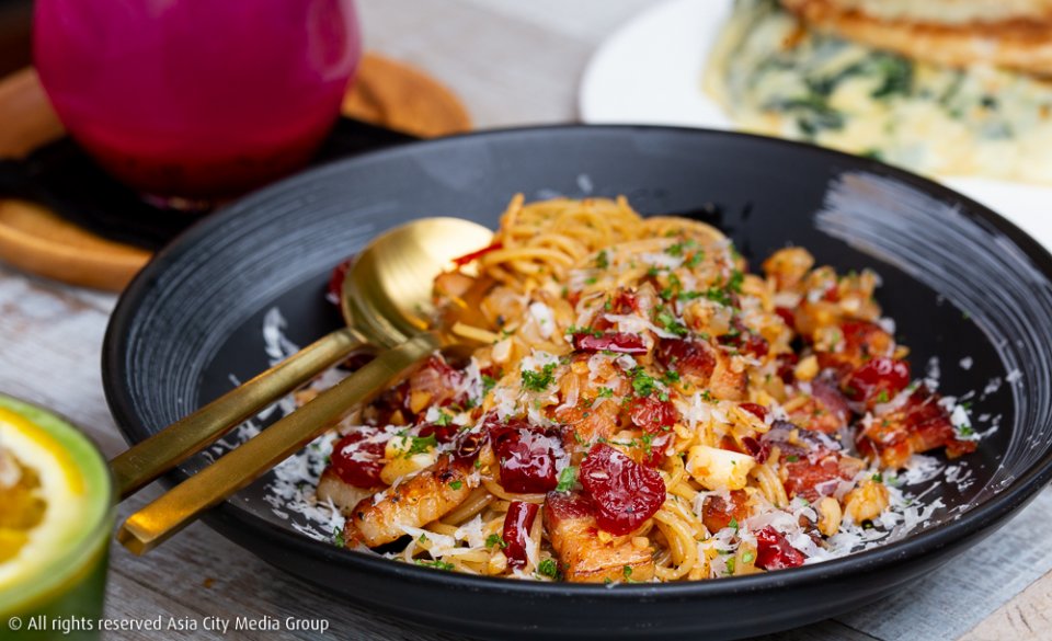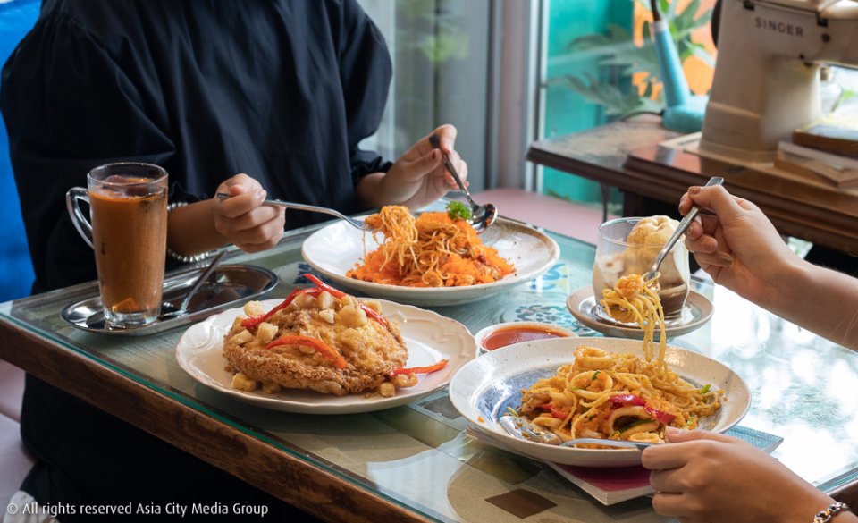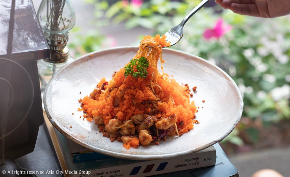 แม้แต่อาหารก็ยังครีเอทตามคอนเซ็ปต์ Dadaism ทำให้ได้เมนูที่ไม่เคยกินที่ไหนมาก่อน อย่างข้าวไข่เจียวกากหมู (165 บาท) แองเจิ้ลแฮร์น้ำพริกนรกไข่กุ้ง (290 บาท) ที่ให้ไข่กุ้งเยอะแบบสะใจเรามาก และสปาเก็ตตี้ปลาหมึกไข่เค็ม (260 บาท) ใครไม่ชอบปลาหมึกผัดไข่เค็มแบบน้ำมันพริกเผาเยิ้มเต็มจานเราแนะนำให้ลองจานนี้