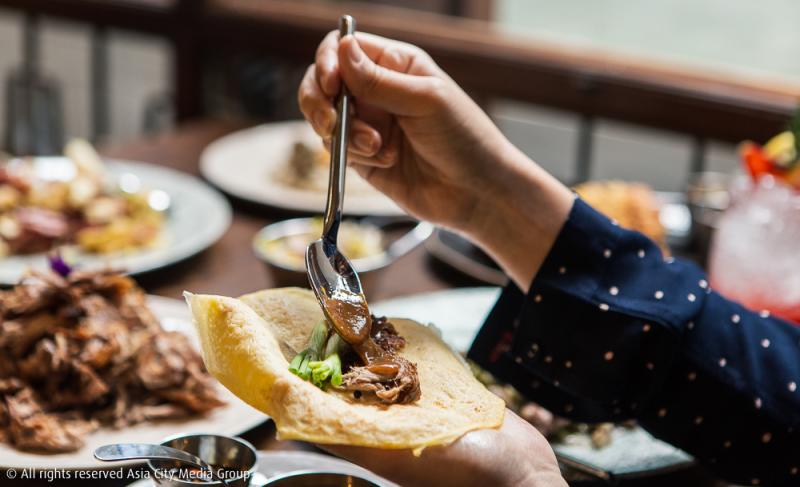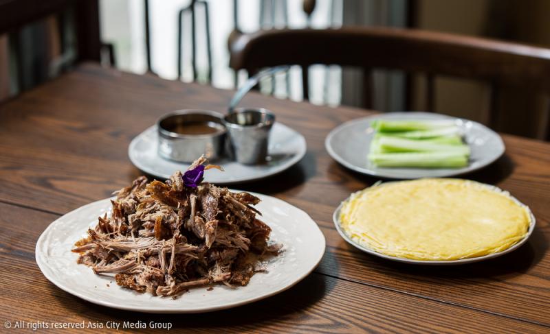 อย่างจานแรกที่เราได้ลองคือเมนูซิกเนเจอร์ของที่นี่ Yard's Grumbly Duck (ครึ่งตัว 450 บาท เต็มตัว 850 บาท) เป็ดย่างแบบเป็ดปักกิ่ง แต่ทางร้านเลือกที่จะนำเป็ดมาซุยทั้งเนื้อและหนังรวมกันไปเลย ทำให้เราได้กินทั้งเนื้อทั้งหนังอร่อย ๆ ไปพร้อมกัน สั่งแผ่นปอเปี๊ยะสด (50 บาท) ที่เปลี่ยนจากแผ่นแป้งปอเปี๊ยะเป็นแผ่นแป้งเครปแทน แม้จะหนากว่าแป้งปอเปี๊ยะนิดหน่อย แต่ตัวแป้งนุ่มมาก ๆ ให้ความรู้สึกเหมือนกินไข่แพฟู ๆ ห่อเป็ดอยู่เลย ราดด้วยน้ำซอสสูตรพิเศษของทางร้านที่มีรสชาติคล้ายซอยราดข้าวหน้าเป็ดย่าง จานนี้เด็ดจริง คนรักเป็ดน่าจะติดใจไม่ยาก อ้อ เป็ดที่นี่ทอดใหม่ทุกวันนะ ฉะนั้นจะไม่มีกลิ่นหืนแน่นอน