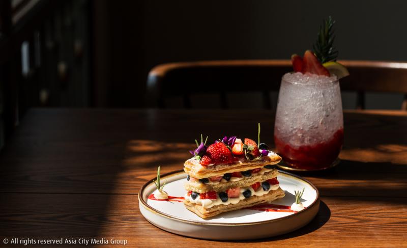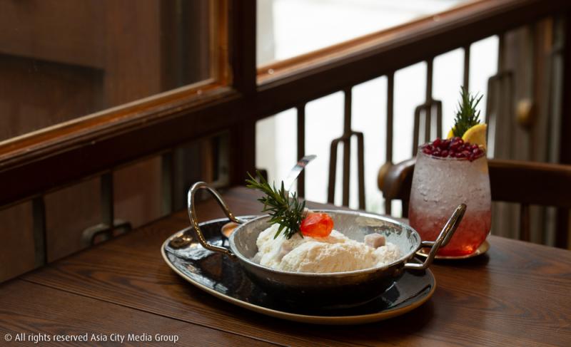 นอกจากของคาวแล้ว ที่ The Yard Restaurant ก็มีครัวเบเกอรี่และของหวานอีกด้วย ทำให้มีของหวานทั้งแบบอีสต์เอเชียและยุโรปคอยเสิร์ฟเราอยู่หลายเมนูเช่นกัน เราลองสั่ง Mixed Berries Mille Feuille (250 บาท) มิลล์เฟยที่ไม่หวานมาก แป้งกรอบกำลังดี และมิกซ์เบอร์รี่ก็เปรี้ยวนำช่วยตัดรสหวานของครีมได้ดี อีกเมนูคือ เกล็ดหิมะบัวลอยเผือกไข่เค็ม (250 บาท) เมนูของหวานสไตล์จีนช่วยดับร้อนเหมาะกับอากาศบ้านเรา ทางร้านนำเปือกสดมาทำเป็นบัวลอย ราดด้วยน้ำกะทิที่ใส่ไข่เค็ม และท๊อปด้วยไข่เค็มแดง คนชอบไข่เค็มน่าจะฟินอยู่ เพราะไข่เค็มที่นี่ไม่เค็มเลย มีแต่ความมัน