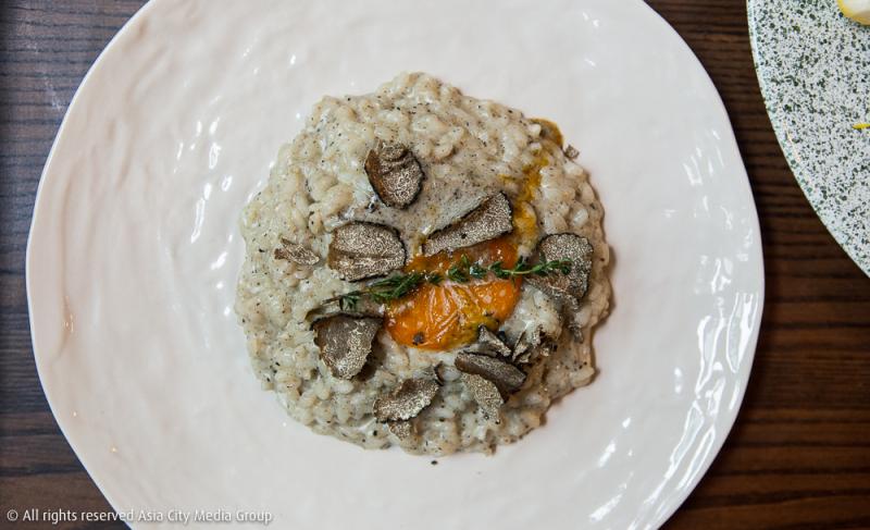 ส่วนใครที่รักทรัฟเฟิล ที่ The Yard Restaurant ก็มีหลายเมนูทรัฟเฟิลให้ลองกันแบบเน้น ๆ อย่าง Homemade Pasta Sausage with Truffle Sauce (480 บาท) จานนี้ถือเป็นการรวมเอาของดียุโรปเข้าไว้ด้วยกัน ตั้งแต่เส้นพาสต้าผักโขม Tagliatelle ที่ทำสดใหม่ทุกวันในครัว ในเส้นนั้นนอกจากจะมีผักโขมแล้วยังใส่เห็ดอโรมาลงไปด้วยเพราะเขาลองแล้วมันเข้ากันมาก ๆ นำไปผัดกับไส้กรอก และทรัฟเฟิลซอส ที่ทำมาจากทั้ง Black และ White Truffle ที่อิมพอร์ตมาจากเมืองอัลบา ประเทศอิตาลีกันเลยทีเดียว ส่วนอีกจานคือ Truffle Risotto (490 บาท) ข้าวอิตาลีแบบริซอตโต้ ผัดกับ Black Truffle Cream ที่ผสม White Truffle นิด ๆ ท๊อปด้วยไข่แดงที่นำไป Sous Vide แล้วยัดไส้ทรัฟเฟิลเข้าในข้างในไข่แดงเพิ่มอีก ใครที่เป็นคอทรัฟเฟิลจริง ๆ แนะนำให้เพิ่ม Black Truffle สดฝานเป็นแผ่น ๆ ลงไปอีก (850 บาทต่อ 5 กรัม) ไม่ฟินให้มันรู้ไปสิ