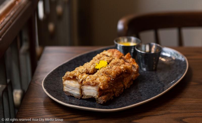 แต่จานที่เราปลื้มมาก ๆ คือเมนูที่เมือนทำง่ายแต่จริง ๆ แล้วทำยากน่าดูอย่างหมูกรอบสไตล์ฮ่องกงที่มาชิ้นใหญ่ ๆ เน้น ๆ เราจะคุ้นเคยกับหมูกรอบฮ่องกงที่มาเป็นชิ้นใหญ่แบบนี้อยู่แล้ว แต่สไตล์ฮ่องกงนั้นหนังจะไม่ฟูกรอบแบบที่เราคุ้นเคยกัน (จะเป็นแบบหนังกรอบบางมากกว่า) แต่ทางร้านได้นำมาปรับใหม่ให้เป็นหนังฟู ๆ แบบที่เราชอบ ทอดทั้งชิ้น กรอบนอกนุ่มใน ความดีงามคือขนาดกินช้า ๆ เหลือทิ้งเอาไว้ ย้อนกลับมากินอีกทีก็ยังกรอบ ! นี่มันนวัตกรรมชัด ๆ จิ้มกับซอสมัสตาร์ดสูตรโฮมมี่หรือซีอิ๊วดำหวานก็เข้ากัน อีกจานไทย ๆ คือยำดอกไม้ทอด (285 บาท) ที่ประกอบไปด้วยดอกเฟื่องฟ้าและดอกอัญชันปลูกเอง นำไปชุบแป้งทอดกรอบ โรยด้วยดอกไม้สดตกแต่งที่นำเข้าจากญี่ปุ่นและฝรั่งเศส ที่สำคัญคือกินได้ทั้งจานนะจ๊ะ เวลากินก็บีบเลมอนให้ทั่วสักหน่อย แล้วตักน้ำยำแบบที่ใส่เนื้อกุ้งสด ส้มโอ และพริกเผาหน่อย ๆ ราดลงไป ถูกใจคนชอบกินยำแบบเราเลยล่ะ