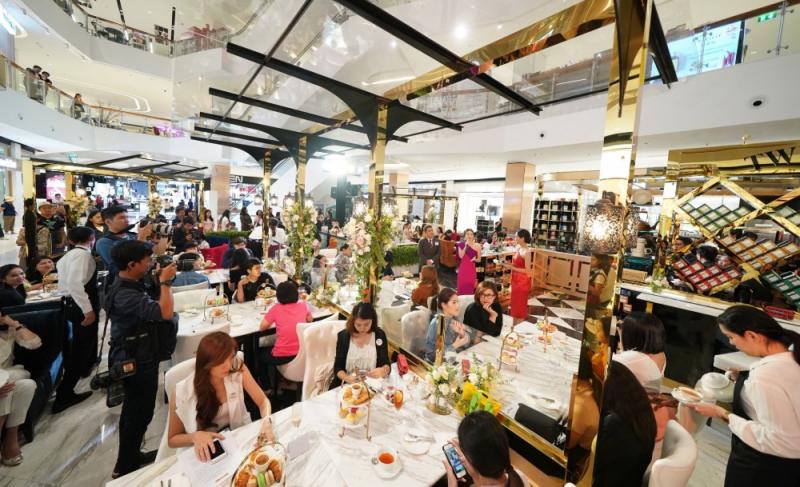 ตัวร้านมีขนาดใหญ่แบบเปิดโล่ง ตั้งเป็น Island อยู่กลางพื้นที่เห็นเด่นชัด เลือกใช้การตกแต่งแบบสีทองและสีโรสโกลด์ที่ช่วยให้ดูหรูหราและชวนนั่งแบบผู้ดีอังกฤษมากขึ้น พอมาพร้อมกับการเลือกใช้หินอ่อนสีขาวประดับในส่วนของอินทีเรียหลัก ทั้งพื้น โต๊ะ ไปจนถึงการเลือกใช้เฟอร์นิเจอร์ประกอบสีขาว ก็ยิ่งทำให้ตัวร้านดูน่านั่งและชวนให้เราเข้าไปหย่อนใจกับเครื่องดื่มและขนมหวานนาน ๆ ไปอีก ซึ่งเราเชื่อว่าหลายคนก็รู้กันอยู่แล้วถึงคุณภาพของชา Twinings ที่มีประวัติยาวนานกว่า 300 ปี