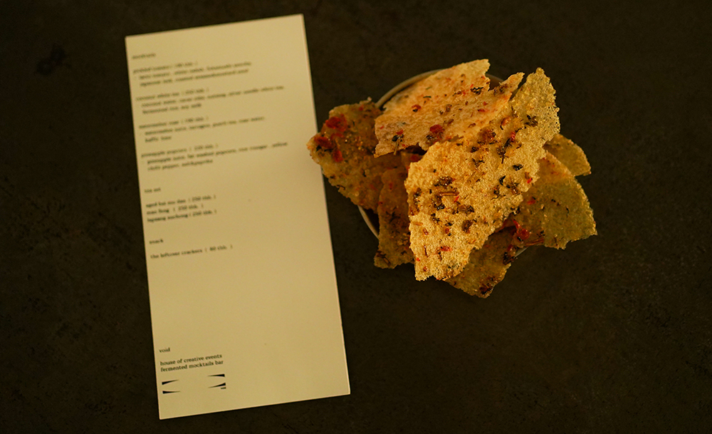 เมื่อซึมซาบกับองค์ประกอบของพื้นที่ผ่านเสียง กลิ่น และภาพแล้ว ก็ลองสัมผัสกับรสชาติที่ Void Bangkok ตั้งใจคัดสรรมาเพื่อให้เราดื่มด่ำบรรยากาศของที่นี่ได้ลึกซึ้งขึ้น โดยเมนูที่เราสามารถเลือกสั่งได้ก็มีตั้งแต่บรรดาม็อกเทลต่าง ๆ ไปจนถึงเซตชาร้อน ที่มีให้เลือกทั้งแบบหอมกลิ่นธัญพืชและแบบฟรุตตี้