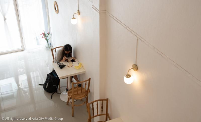 ภายในร้านมีการตกแต่งด้วยโทนสีขาวสะอาด ให้ความรู้สึกสบายตา มีกิมมิกเล็ก ๆ ที่แฝงไปด้วยดอกไม้ที่คุณ Hwang ตั้งใจเลือกซื้อทุกเช้ามาไว้ที่นี่ ประกอบกับไฟอ่อน ๆ นวล ๆ และมีโต๊ะ เก้าอี้คอยให้บริการเพียง 8 ที่เท่านั้น สาเหตุที่มีจำกัดเพราะเป็นความตั้งใจของทางร้านนั่นเองที่ต้องการควบคุมดีไซน์และจะได้ดูแลลูกค้าอย่างทั่วถึง อีกทั้งจะยังได้ซึมซับบรรยากาศแบบเต็ม ๆ ด้วย