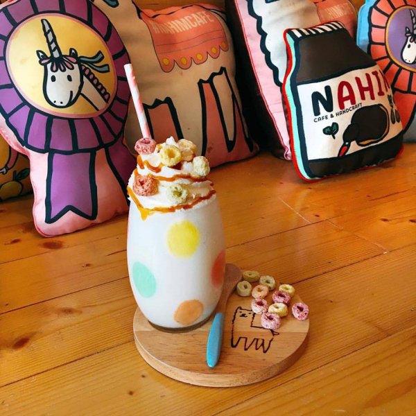 ว่ากันว่า นมกินคู่กับอะไรก็อร่อย แต่จะอร่อยขึ้นไปอีกถ้านมแก้วนั้นจะผสมไอเดียเข้าไปด้วย (สาว ๆ มักคู่กับของคิ้วท์ ๆ อยู่แล้วแหละเนอะ) พอเจอมิลค์เชคสุดน่ารักของร้าน Nahim Cafe เข้าไปก็ถึงกับละลายกันเลยทีเดียว แก้วนี้ทางร้านใช้ไอศกรีมวานิลลาหอมหวาน ปั่นรวมกับนมสดรสธรรมชาติ ตกแต่งลายจุดรอบแก้วด้วยมาร์ชเมลโลหลากสี ออนท็อปด้วยวิปครีม และซีเรียลกรุบกรอบ ได้เทกซ์เจอร์หลากหลายทั้งนมปั่นละเอียด มาร์ชเมลโลเหนียวนุ่ม และซีเรียวเคี้ยวสนุก