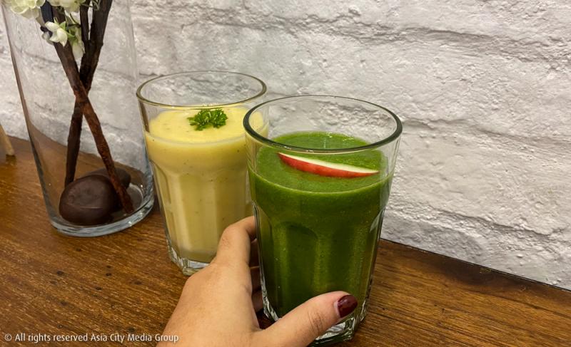 ถึงแม้ว่าเราจะไม่ได้จริงจังขนาดแวะมาปรับโครงสร้างสรีระร่างกายกันที่ Ariya Wellness Center แต่ในพาร์ทของออร์แกนิกคาเฟ่ก็พร้อมเปิดบริการต้อนรับลูกค้าสายสุขภาพทุกคนด้วยเมนูอาหารและเครื่องดื่มที่เขาคิดมาแล้วว่าดีต่อสุขภาพ และเข้ากับรสปากคนไทย อย่างสมู้ทตี้ผักสีเขียว Green Smoothie (189 บาท) ที่เขาเอาผักอินทรีย์ปลอดสารสด ๆ จากสวนมาปั่นให้เราดื่มแบบไม่ใส่น้ำแข็ง ไม่ใส่นม ไม่เติมน้ำเชื่อมใด ๆ