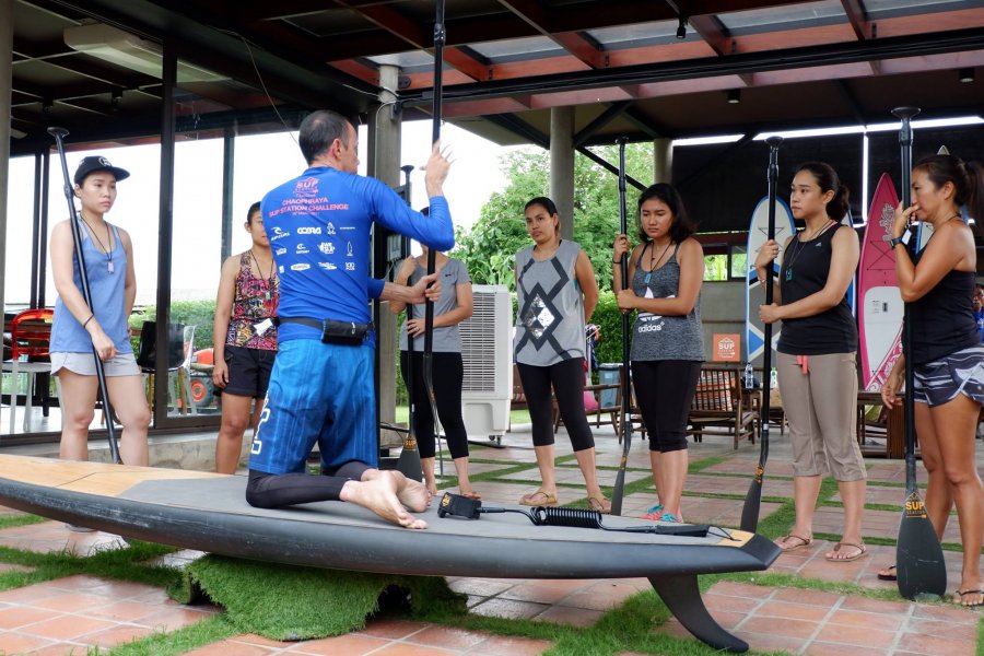ก่อนอื่นเลย เราจะต้องทำความรู้จักกับ Stand-Up Paddle Board หรือ SUP เป็นอย่างแรก เพราะเจ้า SUP นี่แหละเป็นสิ่งสำคัญที่สุดของกิจกรรมนี้ เมื่อลงทะเบียนและรับแท็กชื่อกันเรียบร้อยแล้ว ครูพอลล์ บุณยะรัตเวชจาก SUP Station Thailand ก็เริ่มอธิบายเกี่ยวกับการใช้ SUP และไม้พาย
