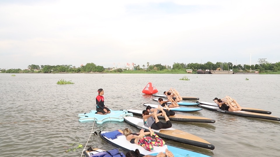อัตราค่าคลาส SUP Yoga อยู่ที่ 1,500 บาท ประกอบด้วยคลาสโยคะ 1 ชั่วโมง และค่าเช่าบอร์ด