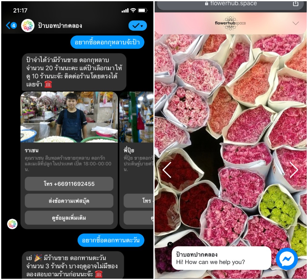 แต่หากใครไม่สะดวกเดินทางไปเลือกดอกไม้ด้วยตัวเอง หรือหากยังกังวลเรื่องมาตรการโซเชียลดิสแทนซิง ก็สามารถขอความช่วยเหลือจากผู้เชี่ยวชาญตัวจริงเกี่ยวกับปากคลองตลาดอย่าง ป้าบอทปากคลอง เพื่อให้ป้าบอทฯ ช่วยเราติดต่อกับพ่อค้าแม่ค้าดอกไม้โดยตรง แล้วจัดส่งดอกไม้ให้เราถึงหน้าบ้านได้
