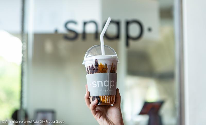 นอกจากที่นี่จะมีร้านให้ชอปและพื้นที่ให้นั่งทำงานแล้ว ยังมีร้านกาแฟน่ารัก ๆ ชื่อ Snap Cafe อีกด้วยนะ ซึ่งแน่นอนร้านกาแฟเองก็ต้องสร้าง concept ให้กับตัวร้านเองด้วยเช่นกัน และต้องมีเมนูพิเศษประจำร้านนั่นก็คือ Nutella Macchiato (140 บาท) กาแฟใส่นมที่ราดด้วยนูเทลล่ารอบ ๆ แก้ว ท็อปด้วยคอนเฟลคกรุบกรอบ นอกจากนี้ยังมีเมนูที่แค่อ่านชื่อก็น่าลองแล้ว อย่าง Lynchee Thai Tea, Khao tan และ Peppermint Cofee ถือว่าเป็นร้านกาแฟที่จิ๋วแต่แจ๋วที่แท้จริง