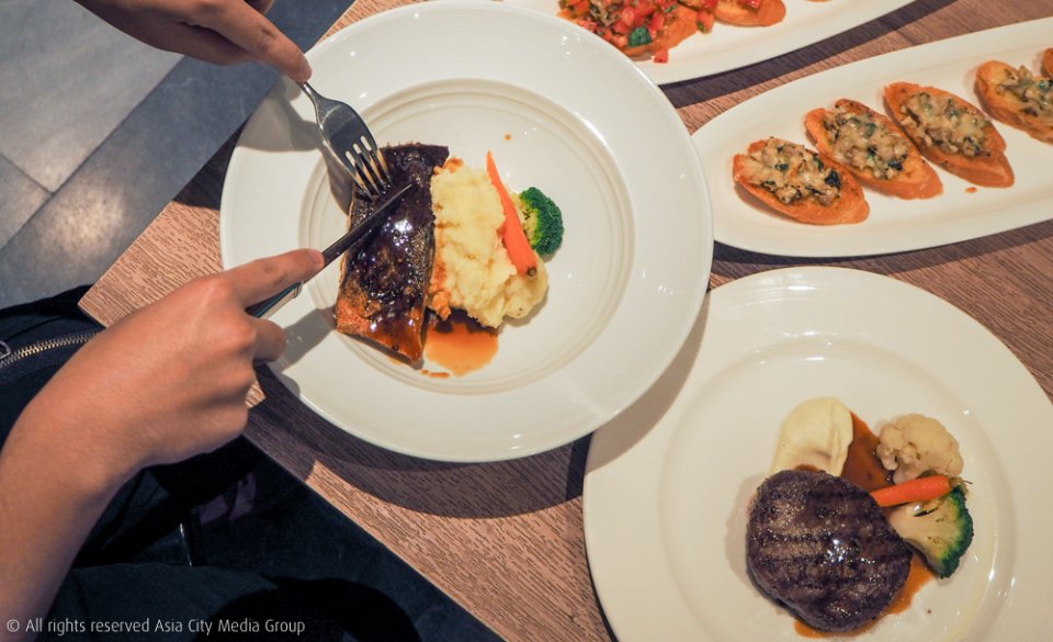 งานสเต็กก็มีให้ลองเช่นกัน เราจัดมาทั้งสตริปลอยน์ (690 บาท) ชิ้นโตที่เสิร์ฟมาพร้อมมันอบ ผักลวก ราดด้วยซอสพอร์ชินี่ เทนเดอลอยด์ (850 บาท) ชิ้นหนาย่างแบบมีเดียมแรร์ เสิร์ฟคู่กับดอกกะหล่ำบดผัดเห็ดรวม และราดซอสทรัฟเฟิลหอมตีจมูกแรง ๆ พอร์คชอป (350 บาท) ชิ้นเป้งที่กินกับซอสไวน์แดง และกริลแซลมอน (490 บาท) ที่มาพร้อมซอสเทอริยากิก็ดีงามตามมาตรฐาน