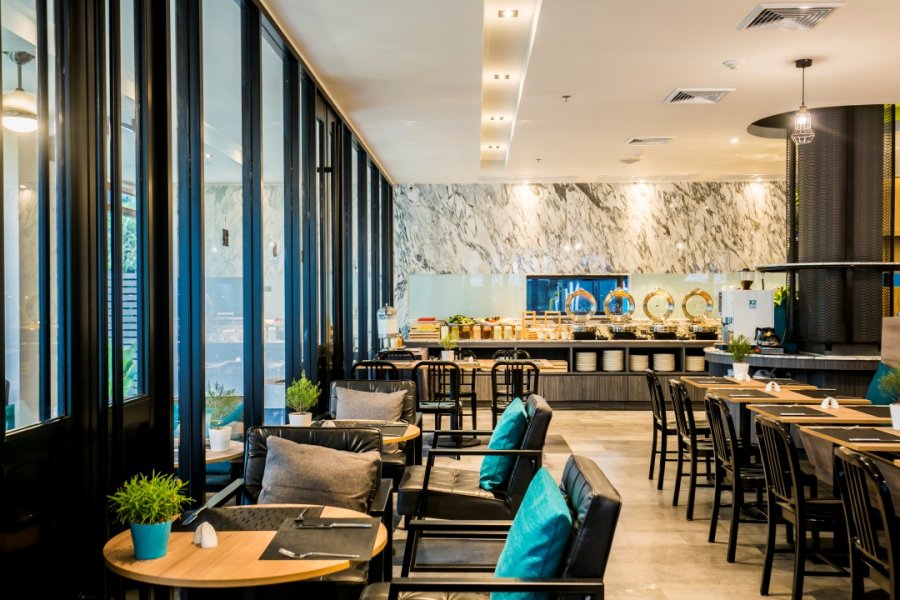 อีกหนึ่งส่วนของโรงแรมที่ถือเป็นปัจจัยอันดับต้น ๆ ของการเลือกเข้าพักก็คือเรื่องอาหารของทางโรงแรมนี่แหละ ที่ X2 Vibe Bangkok Sukhumvit Hotel ก็มีห้องอาหารที่ชื่อ 4K Cafe (อ่านว่า ฟอร์คคาเฟ่) ให้บริการทั้งวันเช่นกัน ตกแต่งแบบอินดัสเทรียลหน่อย ๆ ด้วยการใช้วัสดุอย่างเหล็กและโทนสีดำเป็นหลัก แต่ก็ยังมีเดคอเรทด้วยสีฟ้าเทอร์คอยส์แซม ๆ อยู่บ้าง มีที่นั่งทั้งในห้องแอร์และเอาท์ดอร์ตากลม เรียกว่าได้ Stsy Chill Enjoy อย่างที่ทางโรงแรมอยากให้เป็นเลย