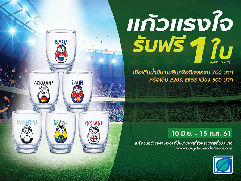 ทางฝั่งของผู้ให้บริการด้านน้ำมันอย่างปั๊มรักษ์โลกสีเขียว บางจาก ก็ออกสินค้าสมนาคุณให้ลูกค้าผู้ใช้รถใช้ถนน ด้วยวัสดุเนื้อดีชื่อน่ารักอย่าง ‘แก้วแรงใจ’ มาพร้อมลวดลายทีมชาติสุดน่าหยิกทั้ง 6 แบบ เพียงเติมน้ำมันบางจากครบ 700 บาท หรือเติม E20 S, E85 S เพียง 500 บาท รับฟรีแก้วไปใช้ได้เลย ระหว่าง 10 มิ.ย. - 15 ก.ค. 61 หรือจนกว่าของจะหมดจ้า