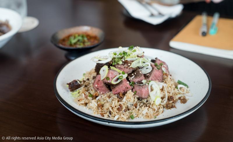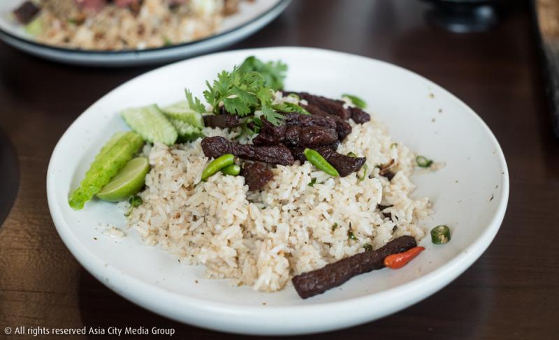 และปิดท้ายด้วย ข้าวผัดเนื้อเค็ม (290 บาท) ที่เราขอมอบกายถวายชีวิตให้เมนูนี้ คืออยากสั่งมาให้ทุกคนได้ลองจริง ๆ เพราะมันคือเนื้อฮิมาวาริที่ผ่านการหมักกับน้ำปลาและน้ำตาลมะพร้าวออร์แกนิค นำไปทอดจนสุกได้ที่ เสิร์ฟพร้อมข้าวหอมมะลิผัดที่ปรุงรสชาติให้เผ็ดด้วยพริกขี้หนูสดสำหรับตัดเลี่ยน