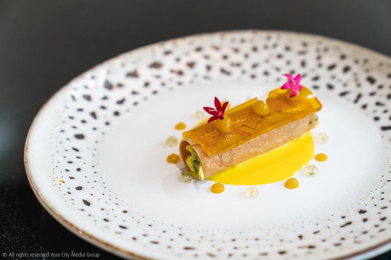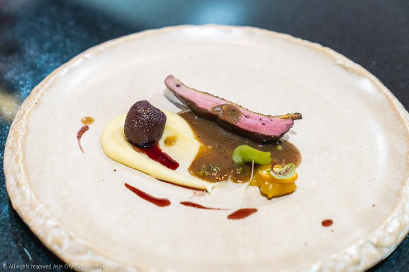 ถัดมาอีกสองเมนูคือจานที่เรียกความทรงจำวัยเด็กของลูกคนจีนได้ดีเวอร์ กับ Roulade กุ้งลายเสื้อเนื้อเด้งดึ๋ง ที่ได้แรงบันดาลใจมาจากผัดคะน้ากุ้ง และเมนูสายอาหารเหลาที่เราคุ้นเคยอย่างอกเป็ดรมควันที่เชฟเอามาต่อยอดด้วยเทคนิค Dry-aged นานถึง 1 อาทิตย์ โดยเลือกใช้เป็นเนื้อเป็ดบ้านแบบ Free-range หรือก็คือเป็ดที่ถูกเลี้ยงแบบปล่อยให้วิ่งเล่นในทุ่งหญ้า เพื่อเนื้อแน่นเหนียวสู้ฟัน ความรักของจานนี้คือการเสิร์ฟพร้อมพุทราจีนเชื่อมไวน์แดงกับเครื่องพะโล้ ตัดรสด้วยซอสพริกไทย 4 ชนิด ที่สร้างรสเผ็ดนิด ๆ ที่ปลายลิ้นตัดเลี่ยนได้ดีเลิศ แถมยังมีมันบดเนื้อเนียนเหนียวสูตรจากร้านติดดาวมิชลิน ใครมาลองร้านนี้แล้วกินมันบดไม่หมด เราจะตี!